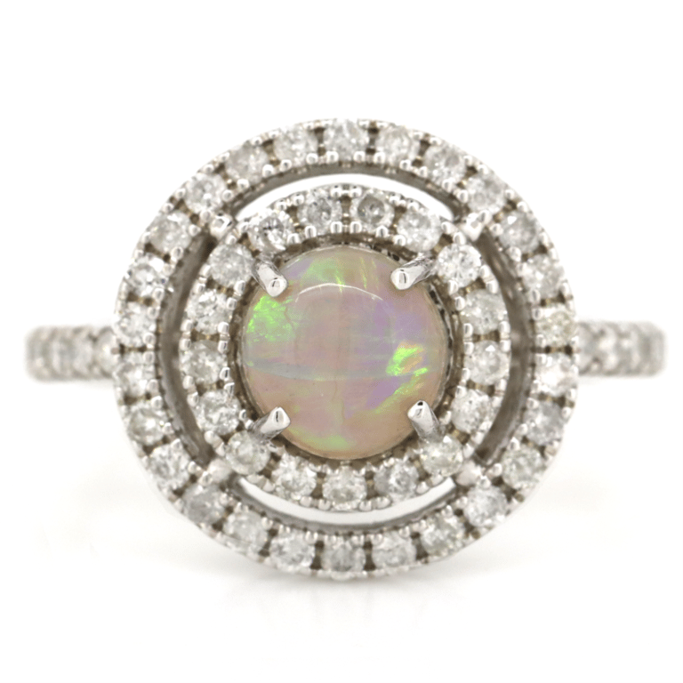 14K WHITE GOLD, 0.95CT AUSTRALIAN COOBER PEDY OPAL AND DIAMOND, DOUBLE HALO RING. The Centre Features, One Round Cabochon Cut, Crystal Base, Australian Coober Pedy Opal (0.95Ct, Red, Orange, Yellow, Green And Violet Colour Play, Patchy Floral Pattern, Heavy Crazing Top Facing), 4 Claw Set. Surrounding The Centre In A Double Halo And Decorating The Band Are, 55 Round Brilliant Cut, Diamonds (0.63Ct Tdw, H-J Colour, P2+ Clarity), Bead Set. Ring Size M 1/2. Valuations Provided by an Independent Third-Party Professional Not Directly Associated With Lloyds Auctions at AUD $$13,800.00This valuation has been conducted by an independent third-party professional. The valuation amount is an assessment by the issuing valuer and does not reflect the auction value of the item. Any inquiries regarding the valuation should be directed to the issuing valuer (refer to contact details on the certificate), as Lloyds Auctions has no affiliation or influence over the valuation, the valuer, or the stated amount. Condition: Good - Refer Images 0645830+8032