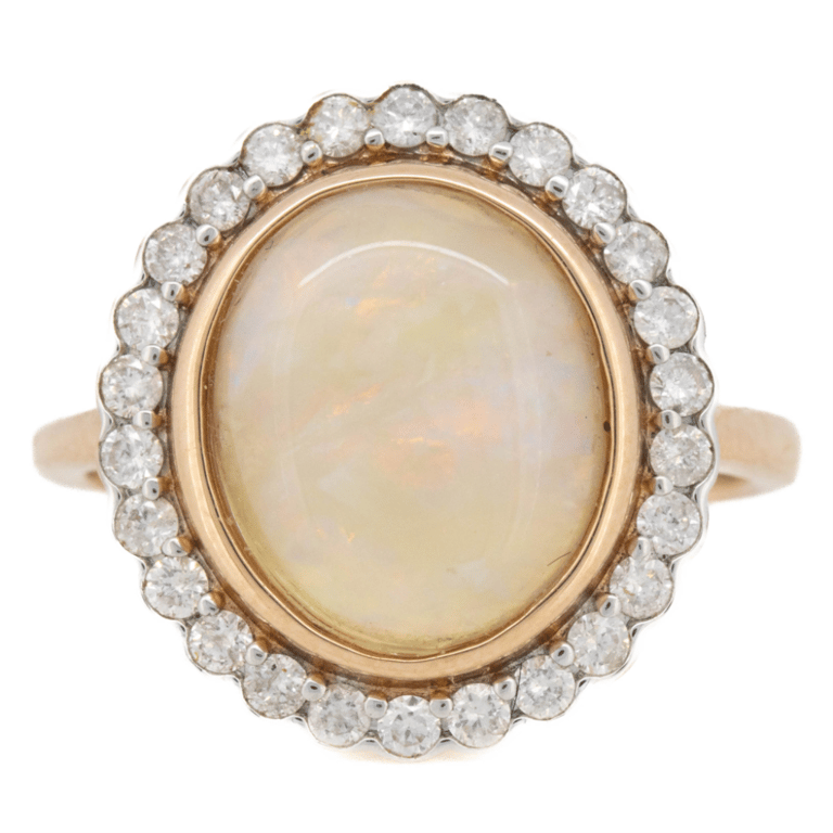14K ROSE GOLD, 2.41CT AUSTRALIAN ANDAMOOKA OPAL AND DIAMOND, HALO RING. The Design Features, One Oval Cabochon Cut, Australian Andamooka Opal (2.41Ct, Green, Violet, Yellow, Orange Colour Play), Bezel Set. Surrounding The Centre In A Halo Are, 26 Round Brilliant Cut, Diamonds (0.39Ct Tdw, J-K Colour, Si1-Si2 Clarity), Semi-Bezel/Bead Set. Ring Size M. Valuations Provided by an Independent Third-Party Professional Not Directly Associated With Lloyds Auctions at AUD $$8,590.00This valuation has been conducted by an independent third-party professional. The valuation amount is an assessment by the issuing valuer and does not reflect the auction value of the item. Any inquiries regarding the valuation should be directed to the issuing valuer (refer to contact details on the certificate), as Lloyds Auctions has no affiliation or influence over the valuation, the valuer, or the stated amount. Condition: Good - Refer Images 0645830+8029