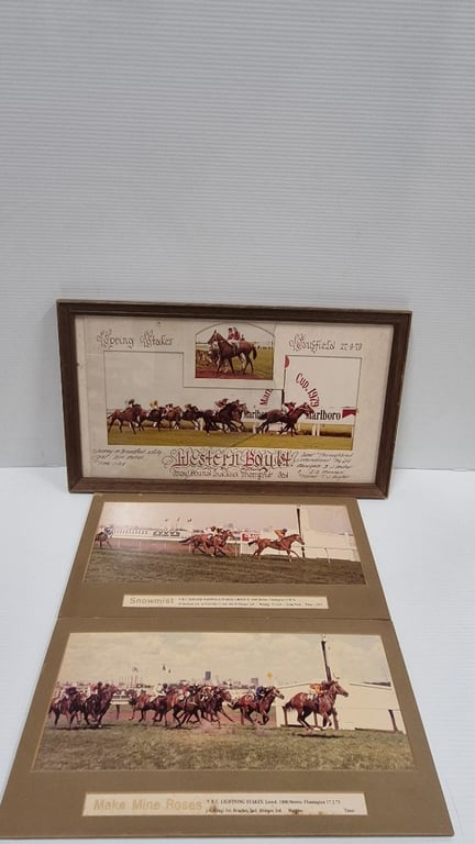 ASSORTED VINTAGE HORSE RACING WINNERS PHOTO MEMORABILIA WESTERN BAY 1ST 1979 BROKEN GLASS SNOWMIST 1ST 1976 MAKE MINE ROSES 1ST 1973 Condition: Fair - Refer To Images LOCATED RACK 13A 587652+4