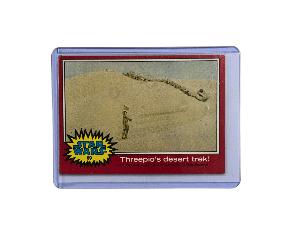 From The Iconic 1977 Topps Star Wars Red Border Series, This Card Features C-3Po Wandering The Tatooine Desert With The Bones Of A Krayt Dragon In The Background.