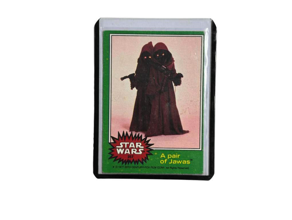 1977 STAR WARS #257 – “A PAIR OF JAWAS” – GREEN BORDERClassic Topps Star Wars Green-Border Card From 1977 Showing Two Jawas Cloaked In Mystery. A Must-Have For Fans Of The Original Trilogy And Vintage Star Wars Collectors.- 1977 Topps Star Wars Card #257- Green Border- Features Two JawasSize: Condition: Good - Refer To Images+76