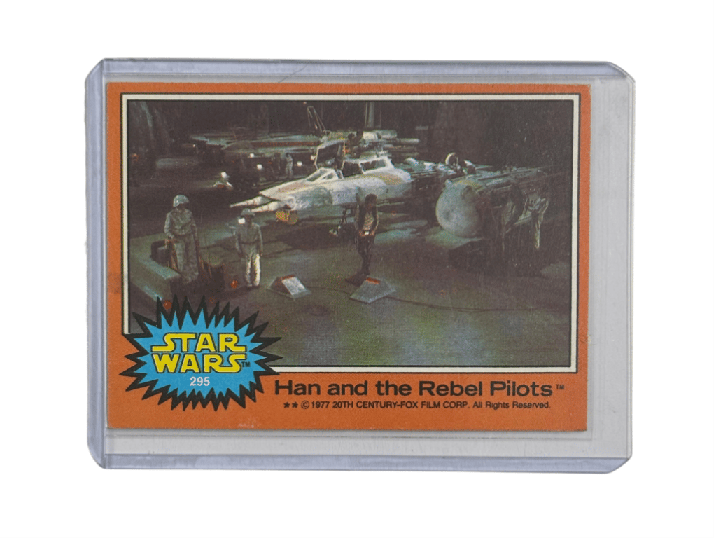 1977 STAR WARS #295 – “HAN AND THE REBEL PILOTS” – ORANGE BORDERClassic Card Showing Han Solo And The Rebel Pilots Preparing Their Ships For Battle. Part Of The 1977 Topps Orange-Border Star Wars Series. A Staple For Collectors Of Vintage Film Memorabilia.- 1977 Topps Star Wars Card #295- Orange Border- Scene: Rebel Hangar With Han SoloSize: Condition: Good - Refer To Images+79