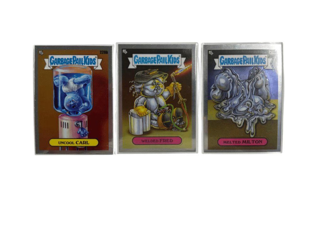 Fun And Freaky Set Of 3 Garbage Pail Kids Cards From The Chrome Topps Collection. Includes Uncool Carl, Welded Fred, And The Gooey Melted Milton – All In Glossy, Metallic Finish.