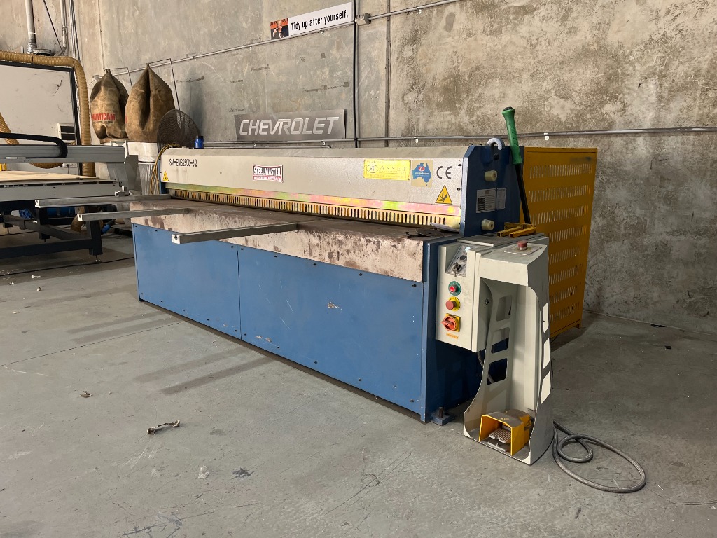DESCRIPTION: The Steelmaster SM-EMS2500-3.2 is an electro shear, a type of motorized guillotine used in metal fabrication for cutting sheet metal. Key features include its 2500mm cutting length and a capacity to cut up to 3.2mm of standard steel. It operates electrically via a clutch pulse, offering 47 strokes per minute in automatic mode. This model is known for its speed, quiet operation, heavy fabricated body for stability, and precision, making it suitable for both production runs and jobbing work.