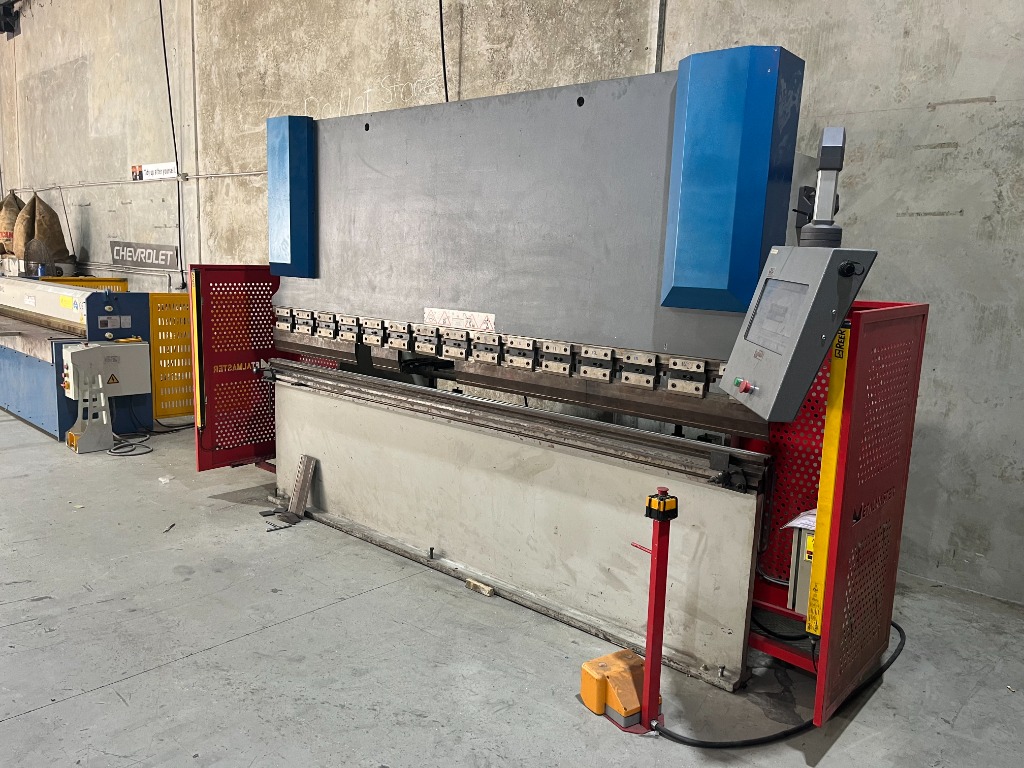 DESCRIPTION: The Metalmaster PB-70E is a 70-ton NC hydraulic pressbrake designed for precision metal bending, featuring an Estun NC-E21 digital control for accurate, repeatable bends. It has a 2500mm bed and a 70-tonne capacity, with a heavy-duty steel frame for rigidity and a torsion bar system to ensure parallelism. Key features include a programmable back gauge, adjustable bending pressure, and modern safety guarding for operator compliance and safety
