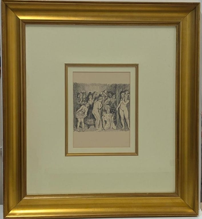 NORMAN LINDSAY (1879 - 1969)Book PlateTitle: On StageImage Size: 29cm x 21.5cmFrame Size: 80cm x 73cmSignature Details: UnsignedCondition: Good - Refer To Images586080+3
