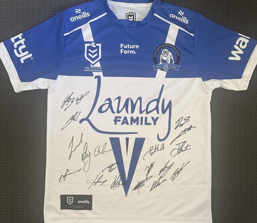 Canterbury Bulldogs Jersey Personally Signed By The 2025 Squad. The Jersey Is Size L. The Item Is Accompanied By A Certificate Of Authenticity.