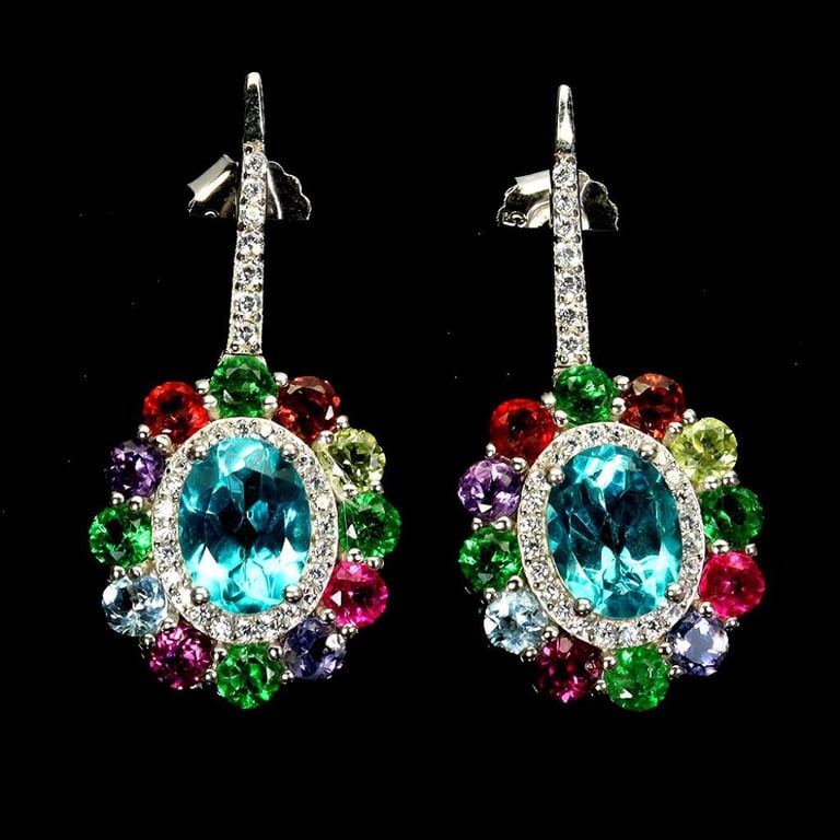 NATURAL BLUE TOPAZ & MULTI GEM EARRINGS Natural Blue Topaz & Multi Gem Earrings. Made In Solid Sterling Silver And Plated In14K White Gold. Features All Natural Blue Topaz, Amethyst, Tanzanite, Green Topaz, Peridot And Garnet. Earrings Measure 30X14Mm Condition: Good - Refer Images 0488241+27