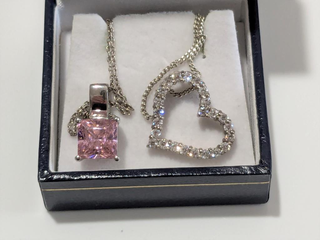 STERLING SILVER PENDANTS INCL HEART SHAPE & PINK STONE, IN BOX, BOTH PENDANTS & CHAINS MARKED 925, SOLD AS LOT Condition: Good - Refer To Images +6
