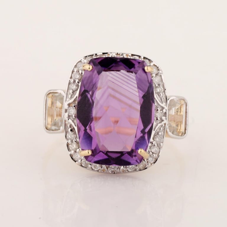 9CT YELLOW GOLD NATURAL AMETHYST / NATURAL WHITE TOPAZ & DIAMOND RING Weight Of The Item: 2.87 GFineness Of Metal(S): Yellow Gold 9KtThe Ring Consists Of (1) Cushion Brilliant Natural Amethyst & (2) Round Brilliant Cut White Topaz. Surrounding The Main Stones Are Round Brilliant Cut Natural Diamonds.Antique StyleIdentification: Natural Amethyst / Natural White TopazColor: Purple / WhiteShape: Cushion Brilliant Cut / Octagon Faceted CutNo. Of Stone: 3Dimension: 14 Mm X 10 Mm X 8.4 MmWeight: 5.1 Carats / 0.7 CaratsCut: Very GoodIdentification: Natural DiamondShape: Round Brilliant CutWeight: 0.24 CtsCut: Excellent. Certificates Are Provided By Gemological Science International (Gsi), An Independent Third-Party Gemological Laboratory Based In The Usa And Recognised Among The Top 10 Gem Labs Globally Markings: 9ct Condition: Good - Refer Images 0488238+32