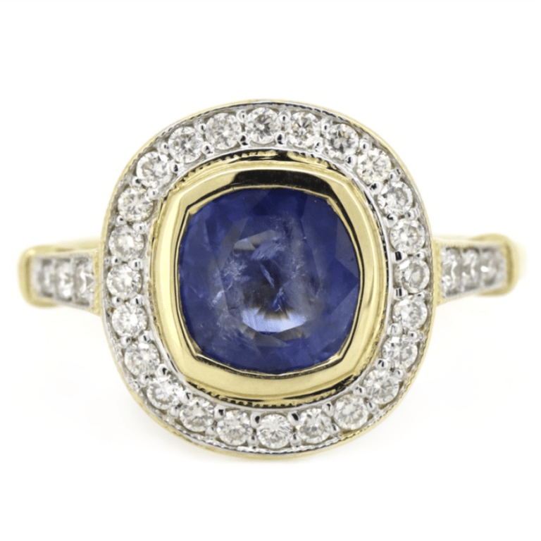 14K YELLOW GOLD, 2.18CT BLUE CEYLON SAPPHIRE AND DIAMOND, HALO RING. The Centre Features, One Cushion Mixed Faceted Cut, Moderate Blue, Ceylon Sapphire (2.18Ct, Moderately Included), Bezel Set. Encompassing The Centre Are, 30 Round Brilliant Cut, Diamonds (0.40Ct Tdw, H-K Colour, P2+ Clarity), Bead Set With Millegrain Detail. Ring Size Q. Valuations Provided by an Independent Third-Party Professional Not Directly Associated With Lloyds Auctions at AUD $$14,900.00This valuation has been conducted by an independent third-party professional. The valuation amount is an assessment by the issuing valuer and does not reflect the auction value of the item. Any inquiries regarding the valuation should be directed to the issuing valuer (refer to contact details on the certificate), as Lloyds Auctions has no affiliation or influence over the valuation, the valuer, or the stated amount. Condition: Good - Refer Images 0586122+13