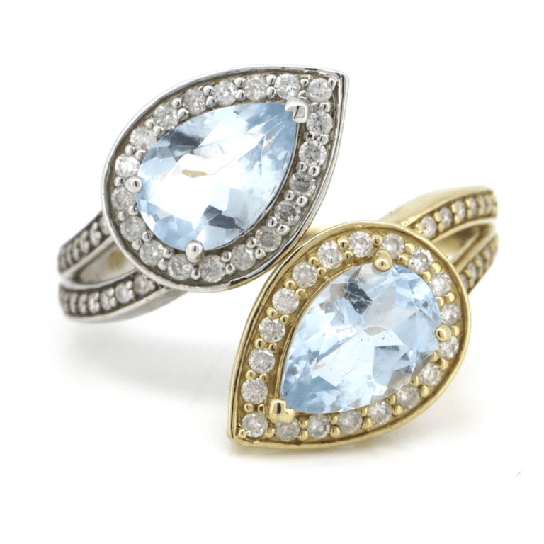 14K WHITE/YELLOW GOLD, AQUAMARINE AND DIAMOND, OPEN BAND DRESS RING. The Design Features, 2 Pear Cut, Medium Greyish-Blue, Aquamarines (2.21Ct Tsw, Eye Clean Clarity), 3 Claw Set. Accompanied By, 70 Round Brilliant Cut, Diamonds (0.48Ct Tdw, J-K Colour, Si1-I1 Clarity), Bead Set. Ring Size P-Q. Valuations Provided by an Independent Third-Party Professional Not Directly Associated With Lloyds Auctions at AUD $$8,390.00This valuation has been conducted by an independent third-party professional. The valuation amount is an assessment by the issuing valuer and does not reflect the auction value of the item. Any inquiries regarding the valuation should be directed to the issuing valuer (refer to contact details on the certificate), as Lloyds Auctions has no affiliation or influence over the valuation, the valuer, or the stated amount. Condition: Good - Refer Images 0586122+50