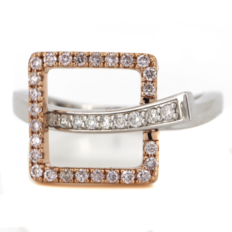 14K WHITE/ROSE GOLD, PINK DIAMOND AND DIAMOND, CONTEMPORARY RING. The Design Features, One Rose Gold Square Holding 26 Round Brilliant Cut, Blush Pink, Diamonds (0.27Ct Tdw, Si1-Si2 Clarity), Bead Set. Decorating The Band Are, 9 Round Brilliant Cut, Diamonds (0.10Ct Tdw, G-H Colour, Si1-Si2 Clarity), Bead Set. Ring Size O 1/2. Valuations Provided by an Independent Third-Party Professional Not Directly Associated With Lloyds Auctions at AUD $$12,000.00This valuation has been conducted by an independent third-party professional. The valuation amount is an assessment by the issuing valuer and does not reflect the auction value of the item. Any inquiries regarding the valuation should be directed to the issuing valuer (refer to contact details on the certificate), as Lloyds Auctions has no affiliation or influence over the valuation, the valuer, or the stated amount. Condition: Good - Refer Images 0586122+40
