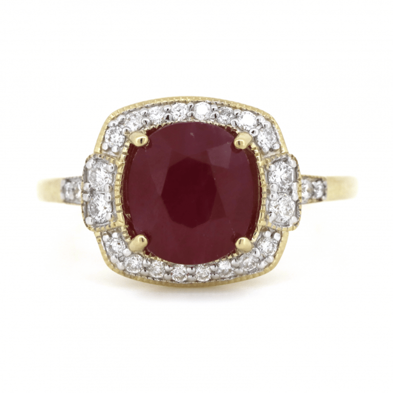 14K YELLOW GOLD, RUBY AND DIAMOND, VINTAGE INSPIRED RING. The Centre Features, One Fancy Cushion Mixed Cut, Ruby (3.06Ct, Moderate Inclusions), Claw Set In Yellow Gold. Encompassing The Centre Are, 24 Round Brilliant Cut, Diamonds (0.27Ct Tdw, H-I Colour, P1-P2 Clarity), Bead Set In Yellow Gold With Millegrain Detail. Ring Size O. Valuations Provided by an Independent Third-Party Professional Not Directly Associated With Lloyds Auctions at AUD $$16,500.00This valuation has been conducted by an independent third-party professional. The valuation amount is an assessment by the issuing valuer and does not reflect the auction value of the item. Any inquiries regarding the valuation should be directed to the issuing valuer (refer to contact details on the certificate), as Lloyds Auctions has no affiliation or influence over the valuation, the valuer, or the stated amount. Condition: Good - Refer Images 0586122+16