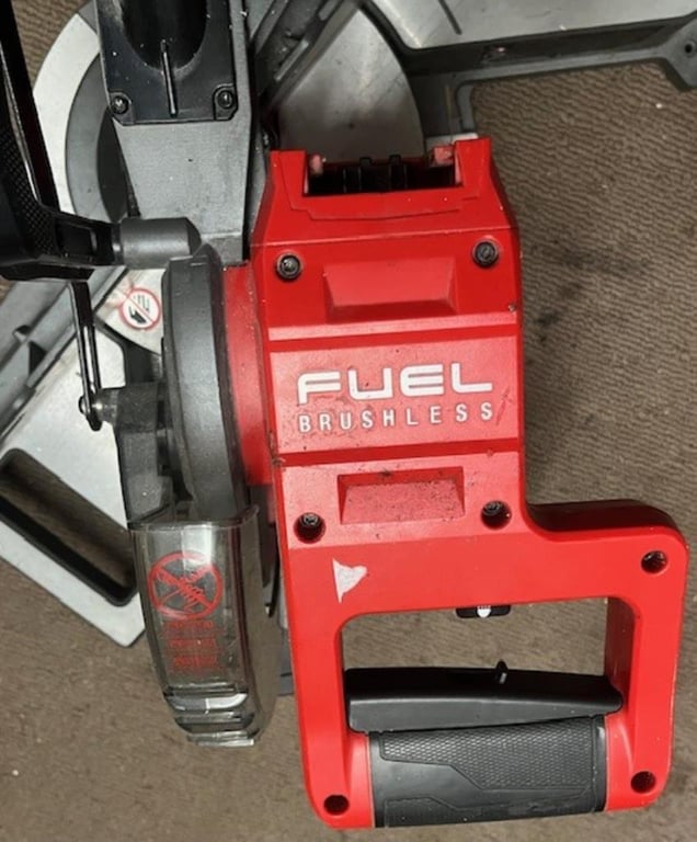 Cordless mitre saw. 1 x Milwaukee M18. 18V, skin only, no battery. Condition: Not working, untested, for parts or repair.