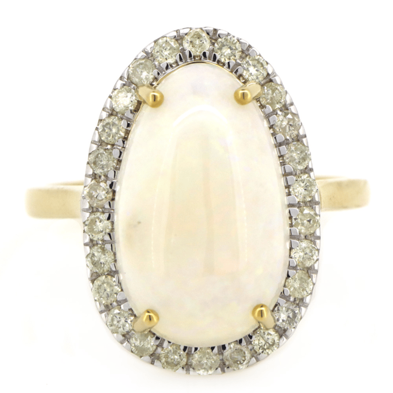 14K YELLOW GOLD, 4.13CT AUSTRALIAN COOBER PEDY OPAL AND DIAMOND, HALO RING. The Centre Features, One Pear Cabochon Cut, Greenish Deep Blue Base, Australian Coober Pedy Opal (4.13Ct, Flashes Of Green And Blue Colour Play, Even-Patchy Floral Pattern), 4-Claw Set. Surrounded By, 26 Round Brilliant Cut, Diamonds (0.38Ct Tdw, H-J Colour, P1+ Clarity), Bead Set. Ring Size M. Valuations Provided by an Independent Third-Party Professional Not Directly Associated With Lloyds Auctions at AUD $$14,200.00This valuation has been conducted by an independent third-party professional. The valuation amount is an assessment by the issuing valuer and does not reflect the auction value of the item. Any inquiries regarding the valuation should be directed to the issuing valuer (refer to contact details on the certificate), as Lloyds Auctions has no affiliation or influence over the valuation, the valuer, or the stated amount. Condition: Good - Refer Images 0645830+8031