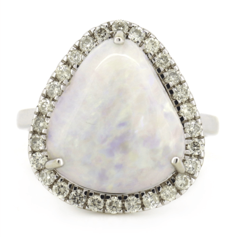 14K WHITE GOLD, 4.12CT AUSTRALIAN ANDAMOOKA OPAL AND DIAMOND, HALO RING. The Centre Features, One Trillion Cabochon Cut, Solid Natural, Australian Andamooka Opal (4.12Ct, Green, Blue, Purple, Pink And Orange Colour Play, Moderate Fire Flash Pattern), Claw Set. Surrounding The Centre In A Halo Are, 28 Round Brilliant Cut, Diamonds (0.45Ct Tdw, H-J Colour, P1+ Clarity), Bead Set. Ring Size M. Valuations Provided by an Independent Third-Party Professional Not Directly Associated With Lloyds Auctions at AUD $$12,800.00This valuation has been conducted by an independent third-party professional. The valuation amount is an assessment by the issuing valuer and does not reflect the auction value of the item. Any inquiries regarding the valuation should be directed to the issuing valuer (refer to contact details on the certificate), as Lloyds Auctions has no affiliation or influence over the valuation, the valuer, or the stated amount. Condition: Good - Refer Images 0645830+8039