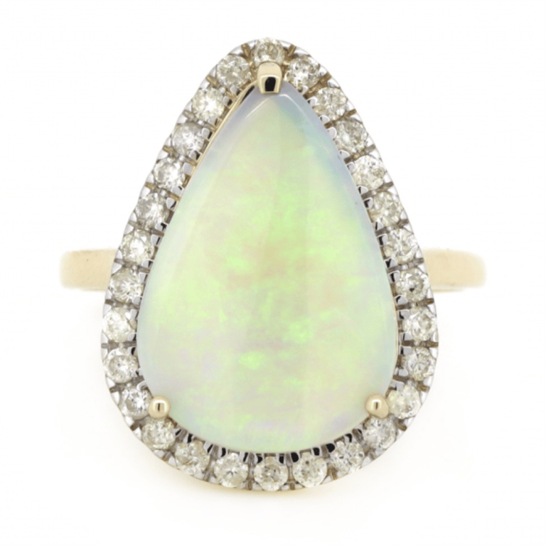 14K YELLOW GOLD, 3.16CT AUSTRALIAN MINTABIE OPAL AND DIAMOND, HALO RING. The Centre Features, One Pear Cabochon Cut, Natural Crystal, Australian Mintabie Opal (3.16Ct, Green And Blue Colour Play, Patchy Broad Flash Pattern), Claw Set. Surrounding The Centre In A Halo Are, 28 Round Brilliant Cut, Diamonds (0.42Ct Tdw, H-J Colour, P1+ Clarity), Bead Set. Ring Size M 1/2. Valuations Provided by an Independent Third-Party Professional Not Directly Associated With Lloyds Auctions at AUD $$15,400.00This valuation has been conducted by an independent third-party professional. The valuation amount is an assessment by the issuing valuer and does not reflect the auction value of the item. Any inquiries regarding the valuation should be directed to the issuing valuer (refer to contact details on the certificate), as Lloyds Auctions has no affiliation or influence over the valuation, the valuer, or the stated amount. Condition: Good - Refer Images 0645830+8043