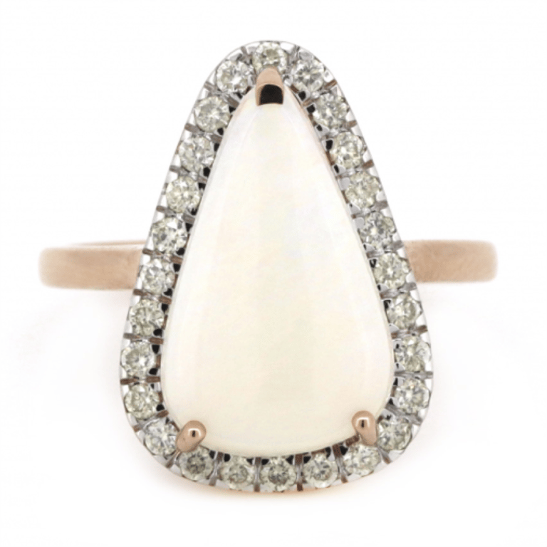 14K ROSE GOLD, 2.76CT AUSTRALIAN MINTABIE OPAL AND DIAMOND, HALO RING. The Centre Features, One Pear Cabochon Cut, White Base, Australian Mintabie Opal (2.76Ct, Full Spectrum Colour With Pink-Orange Fire In Top Facing Including Green, Blue, Purple, Violet Flashes, Slight Crazing Top Facing), Bezel Set. Surrounded By, 26 Round Brilliant Cut, Diamonds (0.35Ct Tdw, H-J Colour, P1+ Clarity), Bead Set. Ring Size N. Valuations Provided by an Independent Third-Party Professional Not Directly Associated With Lloyds Auctions at AUD $$13,600.00This valuation has been conducted by an independent third-party professional. The valuation amount is an assessment by the issuing valuer and does not reflect the auction value of the item. Any inquiries regarding the valuation should be directed to the issuing valuer (refer to contact details on the certificate), as Lloyds Auctions has no affiliation or influence over the valuation, the valuer, or the stated amount. Condition: Good - Refer Images 0645830+8055
