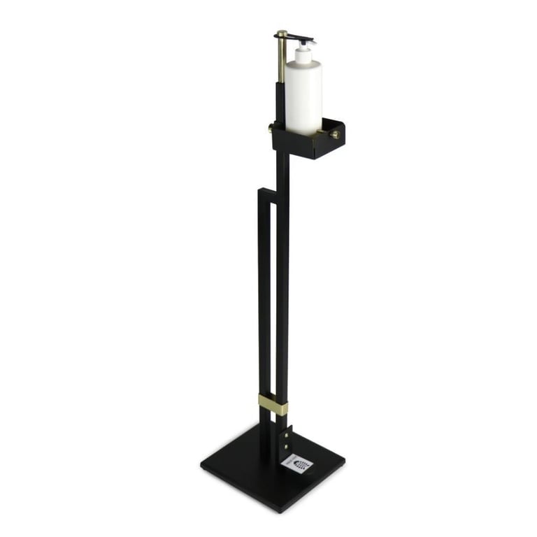 RRP $360 Touchless Hand Soap/Sanitiser Floor Stand with Foot Pedal - Gold BlackBrand New - Orignal Packaging - This Soap/Sanitiser Dispenser Stand is Height Adjustable and can accommodate bottles of various shapes and sizes from 12cm to 32cm tall. The direction of the Bottle Holder can be revolved 360 degrees and placed in any direction. Refer to images. This Free Standing Soap/ Sanitiser Stand has been ergonomically designed and can be placed in any commercial/residential setting. - Product Dimensions (Length) 25cm (Width) 24cm (Height) 105cm - Product Weight 4kg - Colour Gold&Black - Material(s) Iron