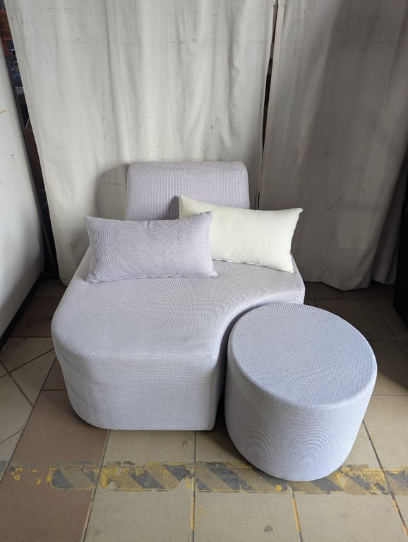 Occasional chair, light grey finish upholstery, includes 2 x cushions and an ottoman Dimensions chair: H 72cm x W 93cm x D 90cmDimensions ottoman: H 40cm x W 45cm x D 45cmSOLD AS LOT