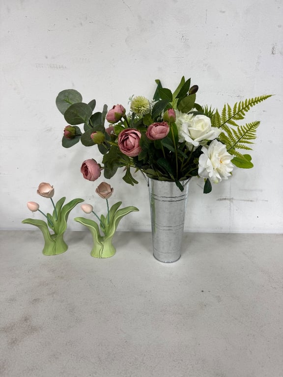 ASSORTED LOT. Metal Storage Box, Synthetic Flower Ornament, Flower Candle Holder. SOLD AS LOT.