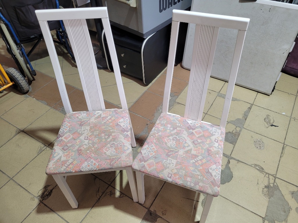 Dining Chairs x2, White Timber Finish, Multi Coloured Pattern FabricDimensions H:105cm W:43cm D:44cmSOLD AS LOT