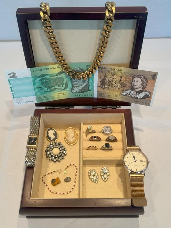 JEWELLERY BOX WITH ASSORTED JEWELLERY INCLUDING STERLING SILVER, VINTAGE, NATURAL OPALS, UNCIRCULATED BANKNOTES & MORE.586047+6