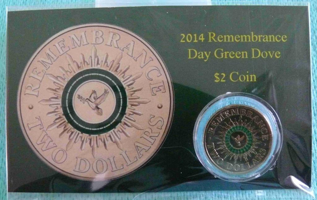 2014 REMEMBRANCE DAY GREEN DOVE, CARDED $2 COIN.
