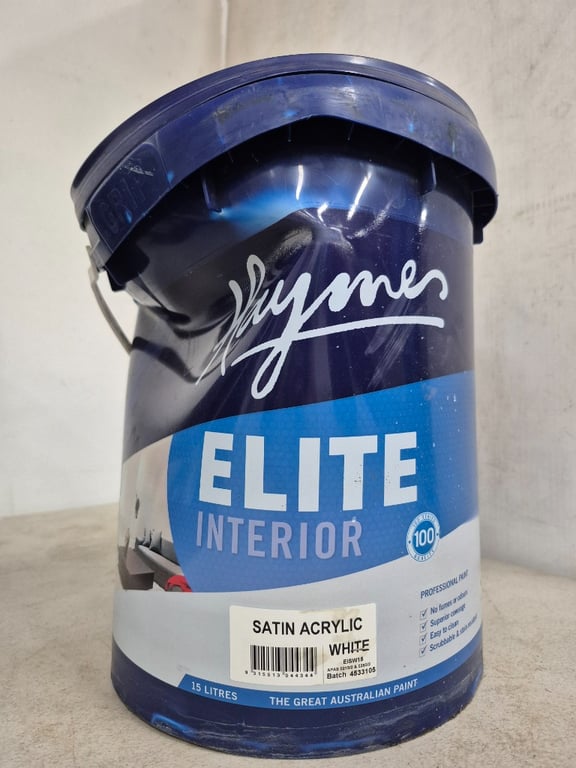 PAINT, HAYMES, ELITE INTERIOR, SATIN ACRYLIC, WHITE, 15LBID PER LITRE, MUST TAKE 15 LITRES