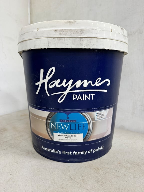 PAINT, HAYMES, PREMIUM NEW LIFE, INTERIOR ACRYLIC, VELVET WALL FINISH WHITE, 15LBID PER LITRE, MUST TAKE 15 LITRES