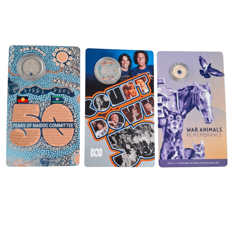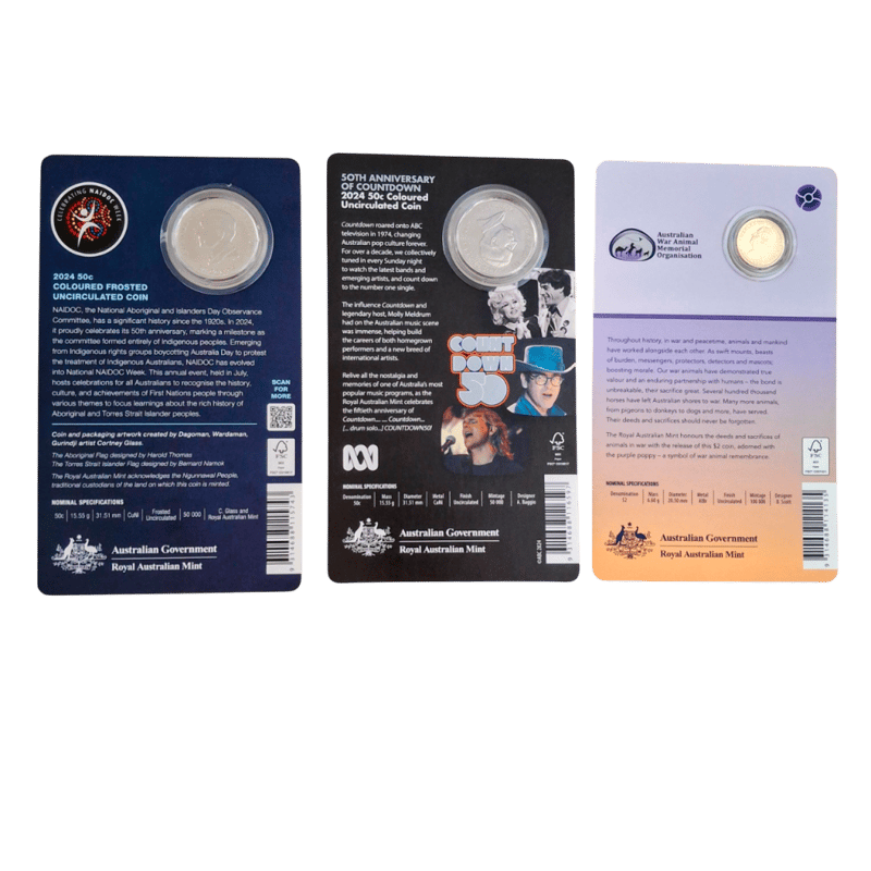 ASSORTED CARDED COINS50 Years Naidoc (50,000 Mintage) 50C, War Animals Rememberace C Mint (100,000 Mintage) $2 & 50Th Anniversary Countdown (50,000 Mintage) 50C Condition: Unc+4 Perth