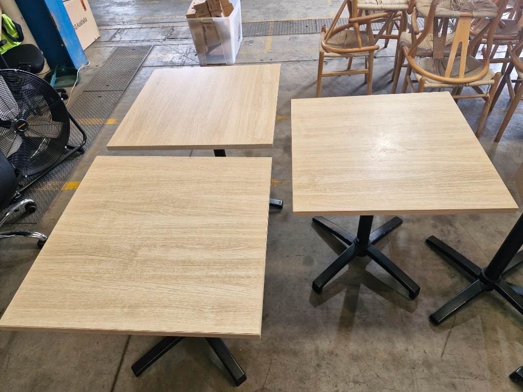 Cafe tables, light timber look veneer top to black metal frame with table, 70cm x 70cmW x 75cmHQty of 3SOLD AS LOTNOTE, MARKS AND WEAR TO ITEM