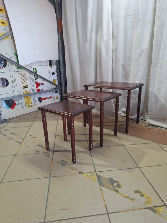 Nesting Side Tables, Dark Timber Finish.Dimensions: Small Table: H 39cm x W 36cm x D 29cm.Dimensions: Medium Table- H 43cm x W 46cm x D 34cm Dimensions: Large Table- H 47cm x W 57cm x D 39cm.SOLD AS LOT.