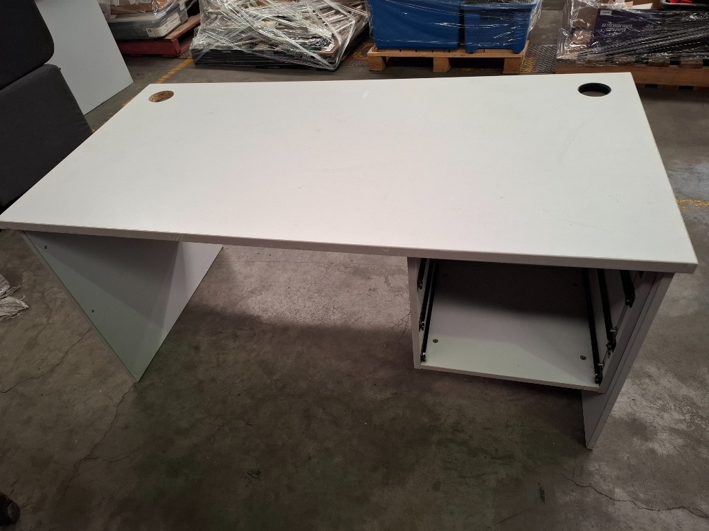 Office desk grey timber Dimensions: 73cm (H)x 150cm ( W)x 75 cm (D) NOTE: SCUFFS AND MARKS, DRAWERS MISSING