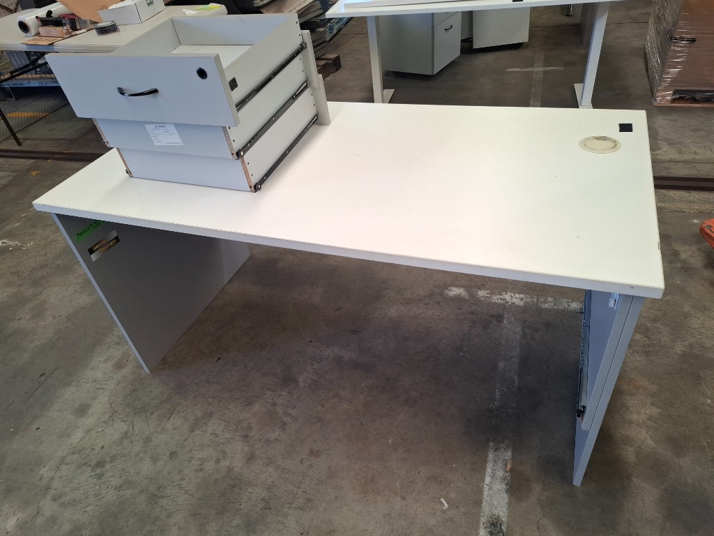 3 drawers offices desk grey timber w/ white desk top frame Dimensions: 73cm (H)x 150cm ( W)x 75 cm (D) NOTE: SCUFFS AND MARKS