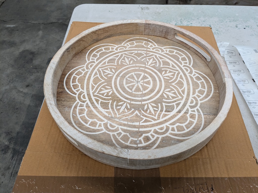 Wooden Round Tray, Natural, White Carved Pattern Dimensions: 40-30cm X 4.5cmH