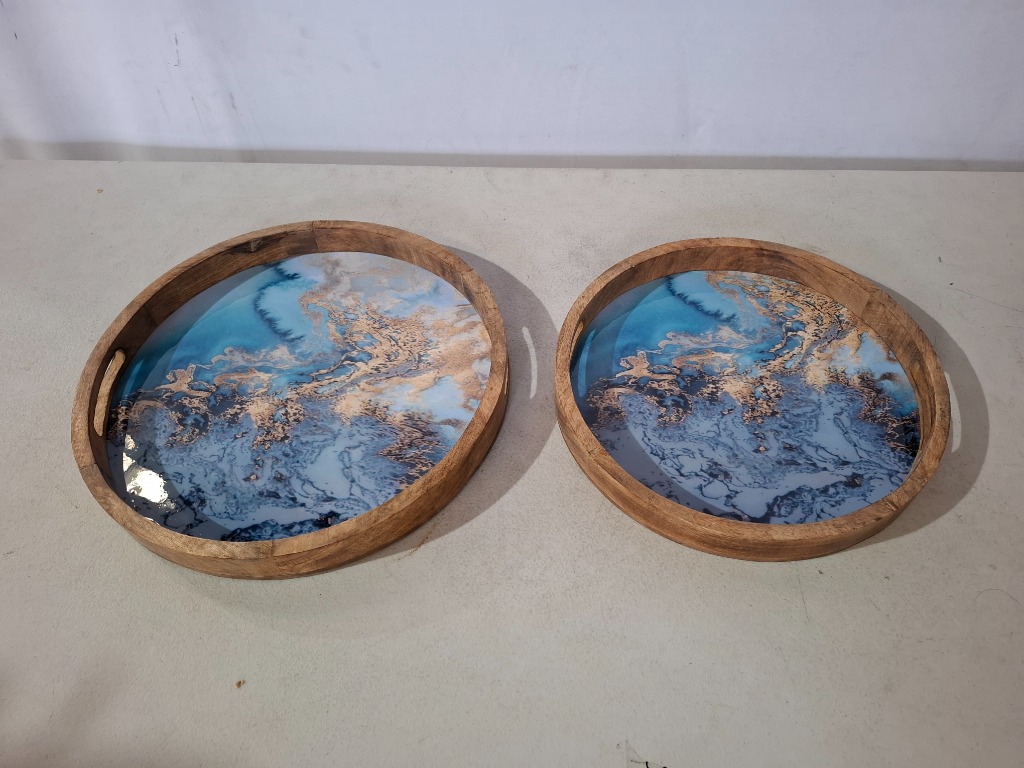Wooden round tray set , acrylic printed base Dimensions: Diameter 40-34 cm x 4.5 cm H