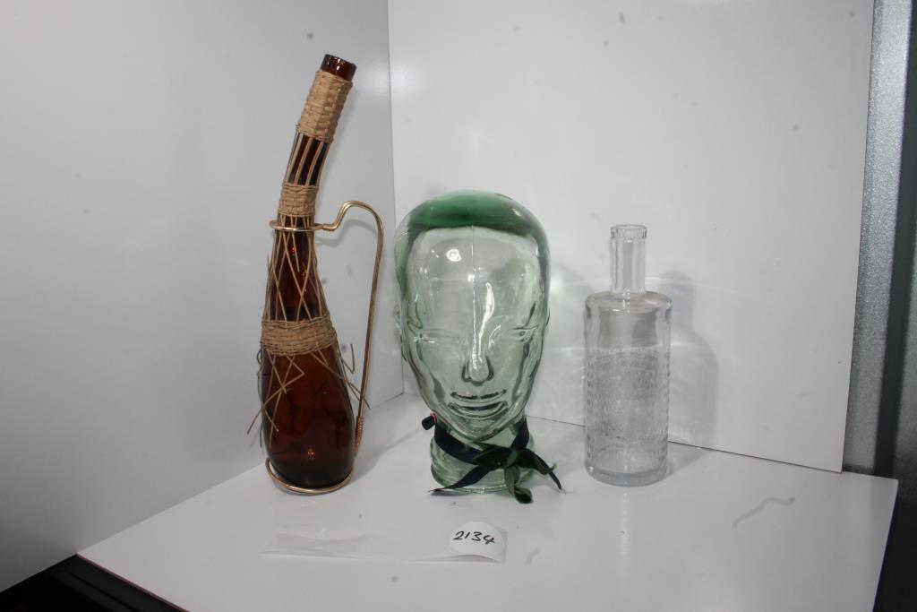Glass Display & Bottle Lot – Mixed Styles (3 Units) Large solid glass mannequin head approx. 30cm tall, a decorative rattan-wrapped brown glass bottle jug with handle (approx. 40cm tall), and a clear embossed apothecary-style bottle with raised text (approx. 26cm tall).