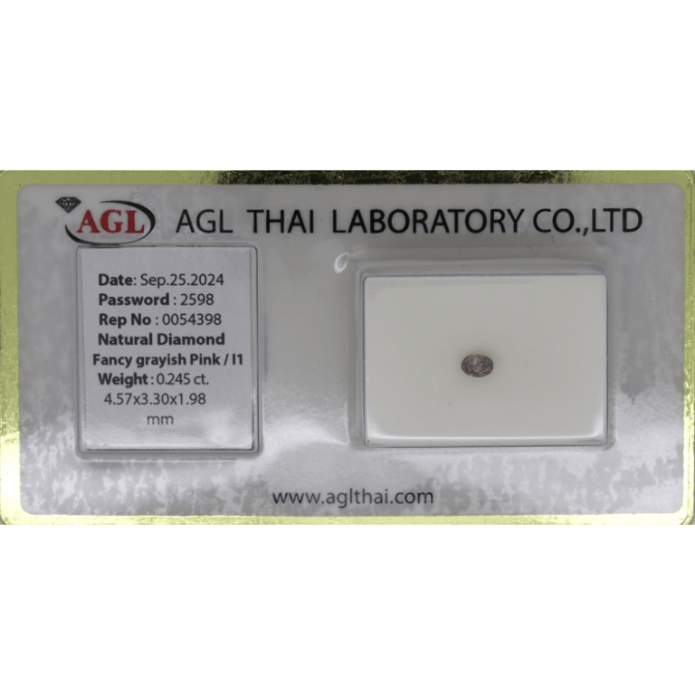 0.245CT CERTIFIED, NATURAL FANCY PINK DIAMOND. Oval Brilliant Cut, Fancy Greyish- Pink, I1 Clarity, Loose, Unset. Stone Comes Sealed With Agl Report: 0054398. Valuations Provided by an Independent Third-Party Professional Not Directly Associated With Lloyds Auctions at AUD $$9,700.00This valuation has been conducted by an independent third-party professional. The valuation amount is an assessment by the issuing valuer and does not reflect the auction value of the item. Any inquiries regarding the valuation should be directed to the issuing valuer (refer to contact details on the certificate), as Lloyds Auctions has no affiliation or influence over the valuation, the valuer, or the stated amount. Condition: Good - Refer Images 06+45827+2367