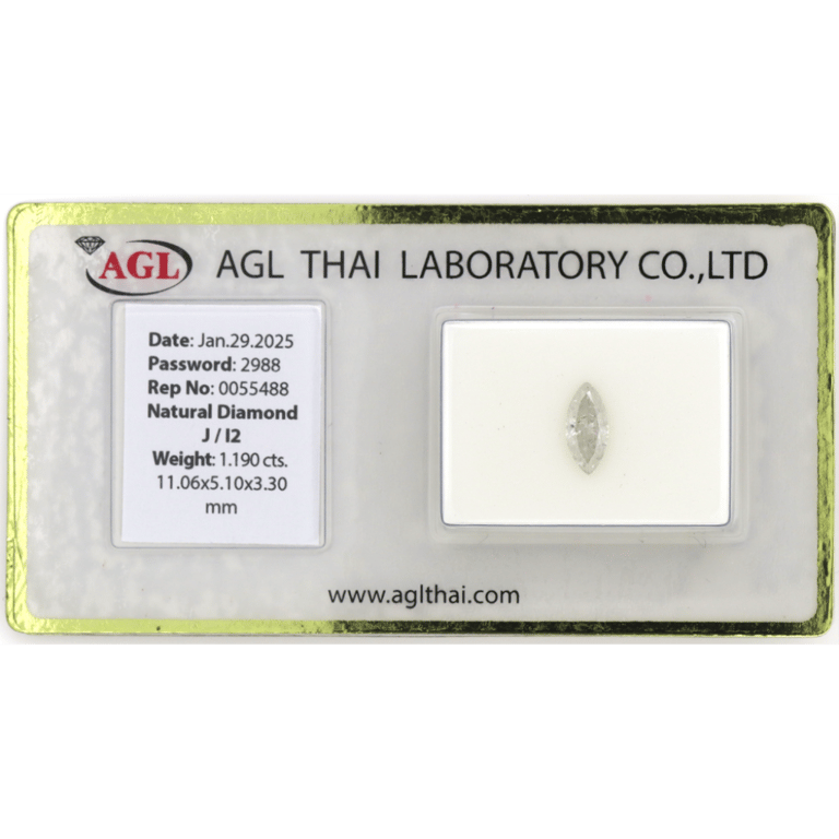 1.190CT CERTIFIED, NATURAL DIAMOND. Marquise Brilliant Cut, J Colour, I2 Clarity, Loose, Unset. Stone Comes Sealed With Agl Report: 0055488. Valuations Provided by an Independent Third-Party Professional Not Directly Associated With Lloyds Auctions at AUD $$10,800.00This valuation has been conducted by an independent third-party professional. The valuation amount is an assessment by the issuing valuer and does not reflect the auction value of the item. Any inquiries regarding the valuation should be directed to the issuing valuer (refer to contact details on the certificate), as Lloyds Auctions has no affiliation or influence over the valuation, the valuer, or the stated amount. Condition: Good - Refer Images 06+45827+2302
