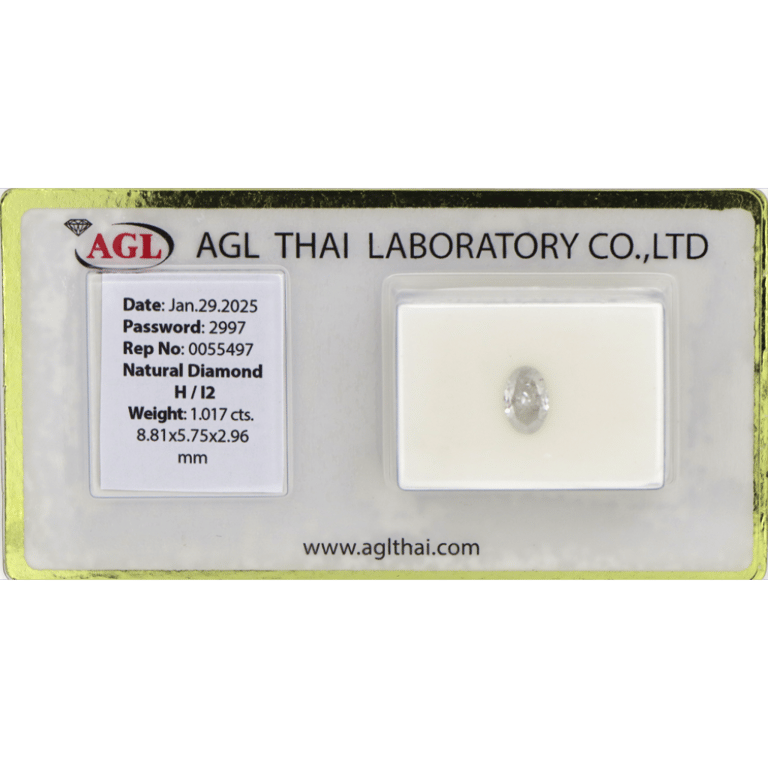 1.017CT CERTIFIED, NATURAL DIAMOND. Oval Brilliant Cut, H Colour, I2 Clarity, Loose, Unset. Stone Comes Sealed With Agl Report: 0055497. Valuations Provided by an Independent Third-Party Professional Not Directly Associated With Lloyds Auctions at AUD $$10,000.00This valuation has been conducted by an independent third-party professional. The valuation amount is an assessment by the issuing valuer and does not reflect the auction value of the item. Any inquiries regarding the valuation should be directed to the issuing valuer (refer to contact details on the certificate), as Lloyds Auctions has no affiliation or influence over the valuation, the valuer, or the stated amount. Condition: Good - Refer Images 06+45827+2360