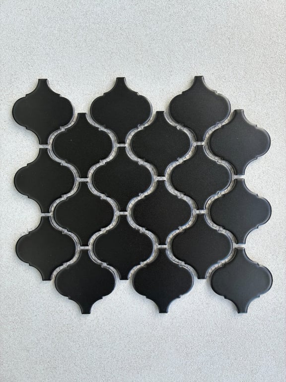 Wall Tiles, Lantern Black Matt Mosaic, Black Colour, Matt, China Origin, Approximate Quantity of 775 Tiles (53.38 Square Meters) Approximate Dimensions: 74mm x 78mm Piece Size Approximate Dimensions: 246mm x 280mm Sheet Size SOLD AS LOT