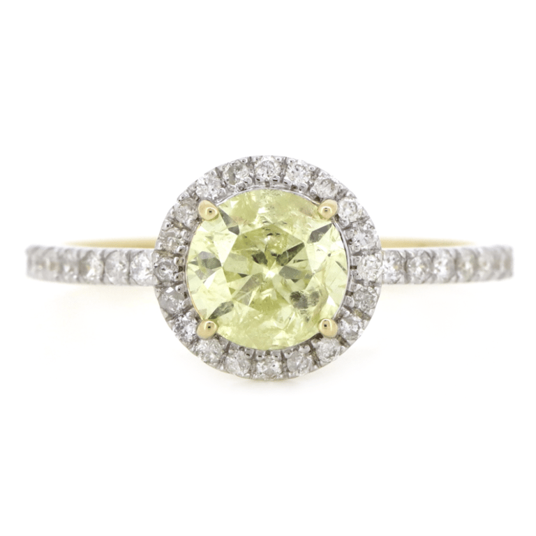 14K YELLOW GOLD, FANCY YELLOW DIAMOND, HALO RING. The Centre Features, One Round Brilliant Cut, Fancy Yellow, Diamond (1.03Ct, P2 Clarity), 4 Claw Set. Surrounding The Centre In A Halo And Decorating The Band Are, 34 Round Brilliant Cut, Diamonds (0.24Ct Tdw, H-J Colour, Si2-P2 Clarity), Claw Set. Ring Size M 1/2. Valuations Provided by an Independent Third-Party Professional Not Directly Associated With Lloyds Auctions at AUD $$15,780.00This valuation has been conducted by an independent third-party professional. The valuation amount is an assessment by the issuing valuer and does not reflect the auction value of the item. Any inquiries regarding the valuation should be directed to the issuing valuer (refer to contact details on the certificate), as Lloyds Auctions has no affiliation or influence over the valuation, the valuer, or the stated amount. Condition: Good - Refer Images 0645829+3389
