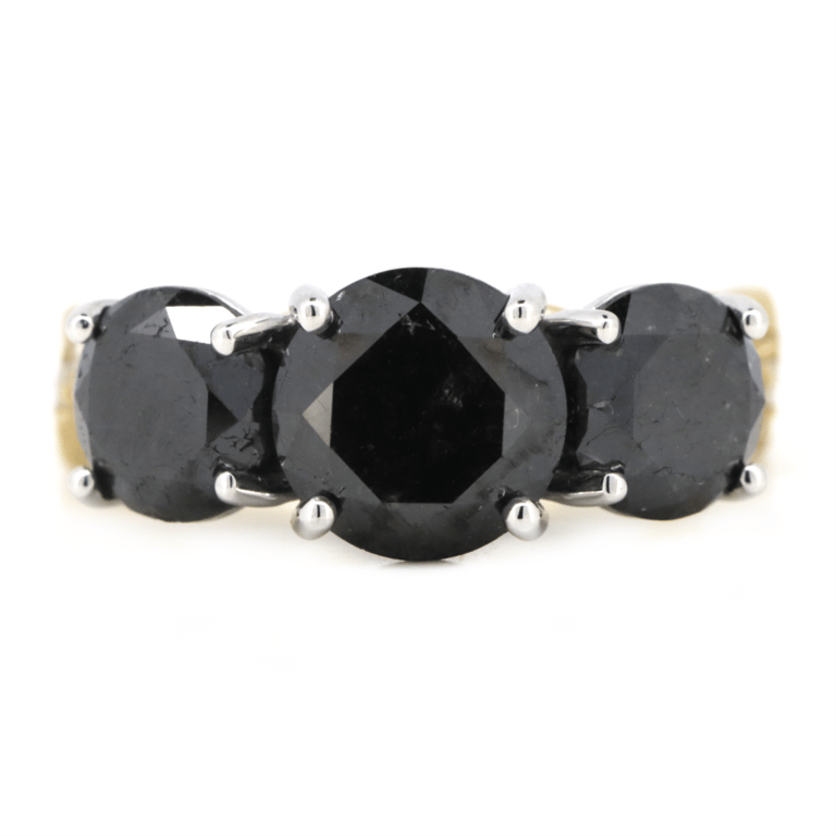 14K YELLOW/WHITE GOLD, BLACK DIAMOND AND DIAMOND, TRILOGY TWIST BAND RING. The Design Features, 3 Round Brilliant Cut, Black, Diamonds (5.14Ct Tdw, Opaque), Claw Set. Decorating The Twist Band Are, 16 Round Brilliant Cut, Diamonds (0.23Ct Tdw, G-H Colour, Si1-Si2 Clarity), Bead Set. Ring Size M 1/2. Valuations Provided by an Independent Third-Party Professional Not Directly Associated With Lloyds Auctions at AUD $$19,000.00This valuation has been conducted by an independent third-party professional. The valuation amount is an assessment by the issuing valuer and does not reflect the auction value of the item. Any inquiries regarding the valuation should be directed to the issuing valuer (refer to contact details on the certificate), as Lloyds Auctions has no affiliation or influence over the valuation, the valuer, or the stated amount. Condition: Good - Refer Images 0645829+3314