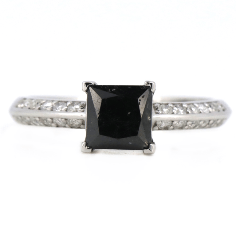 The Centre Features, One Princess Cut, Black, Diamond (1.42Ct, Opaque), 4 Claw Set. Decorating The Band Are, 24 Round Brilliant Cut, Diamonds (0.23Ct, G-H Colour, Si1-Si2 Clarity), Bead Set. Ring Size M1/2.