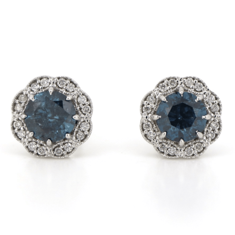 The Centres Feature, 2 Round Brilliant Cut, Fancy Deep Blue, Diamonds (2.02Ct Tdw, Si2-P1 Clarity), Claw Set. Bordering In A Floral Design Are, 32 Round Brilliant Cut, Diamonds (0.19Ct, Tdw, G-H Colour, Si1-Si2-Clarity), Bead Set With Millegrain Detail. The Earrings Have Post Backs, With 14K White Gold Butterfly Clasps.
