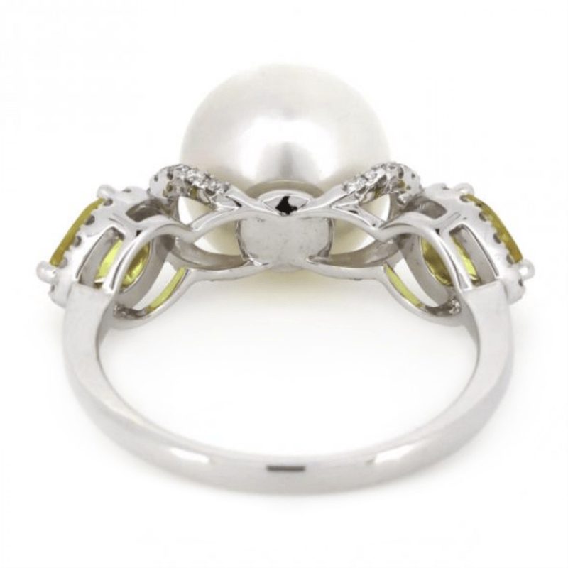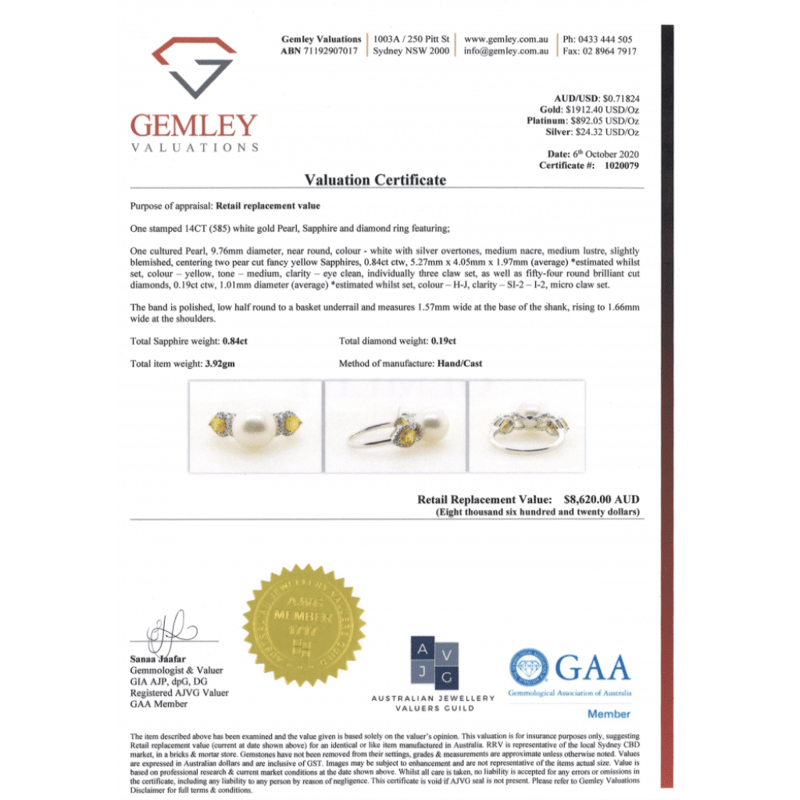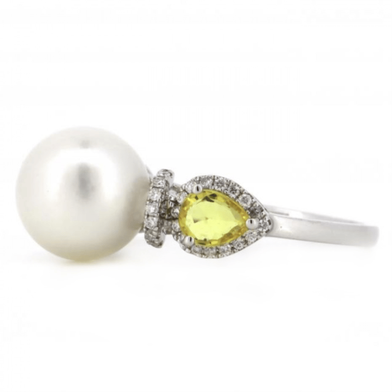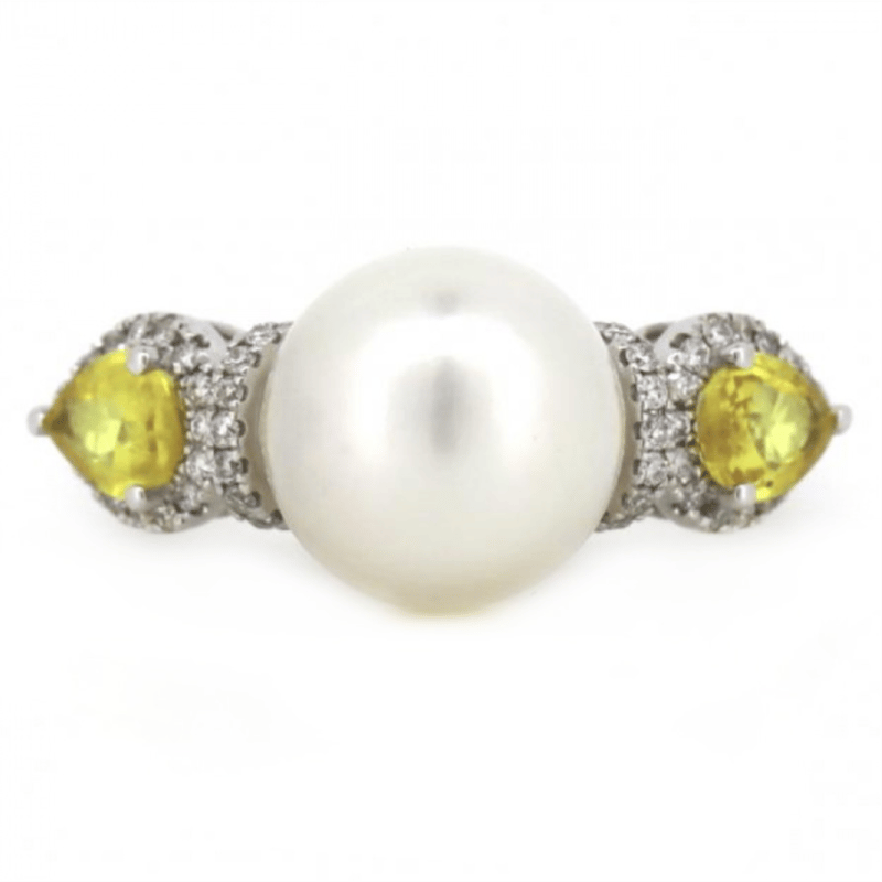 14K WHITE GOLD, WHITE CULTURED SOUTH SEA PEARL, YELLOW SAPPHIRE AND DIAMOND, VINTAGE INSPIRED RING. THE CENTRE FEATURES, ONE NEAR ROUND, WHITE WITH SILVER OVERTONES, CULTURED SOUTH SEA PEARL (9.76MM SIZE, MEDIUM LUSTRE, SLIGHTLY BLEMISHED). FLANKING EITHER SIDE ARE, 2 PEAR CUT, FANCY MEDIUM YELLOW, SAPPHIRES (0.84CT TSW, EYE CLEAN CLARITY), 3 ARE, 54 ROUND BRILLIANT CUT, DIAMONDS (0.19CT TDW, H-J COLOUR, SI2-I2 CLARITY), MICRO-CLAW SET. RING SIZE M. Valuations Provided by an Independent Third-Party Professional Not Directly Associated With Lloyds Auctions at AUD $$8,620.00This valuation has been conducted by an independent third-party professional. The valuation amount is an assessment by the issuing valuer and does not reflect the auction value of the item. Any inquiries regarding the valuation should be directed to the issuing valuer (refer to contact details on the certificate), as Lloyds Auctions has no affiliation or influence over the valuation, the valuer, or the stated amount. Condition: Good - Refer Images 0645878+1555