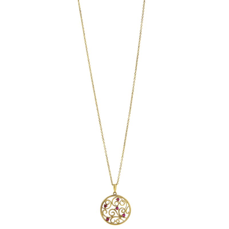 9K YELLOW GOLD AND RUBY, FILAGREE PENDANT NECKLACE. THE PENDANT FEATURES, 5 ROUND BRILLIANT CUT, RUBIES - 3 CLAW SET. THE NECKLACE FEATURES A 44CM CHAIN WITH A BOLT RING CLASP. CONDITION: PRE-OWNED. Condition: Good - Refer Images 0645878+1583