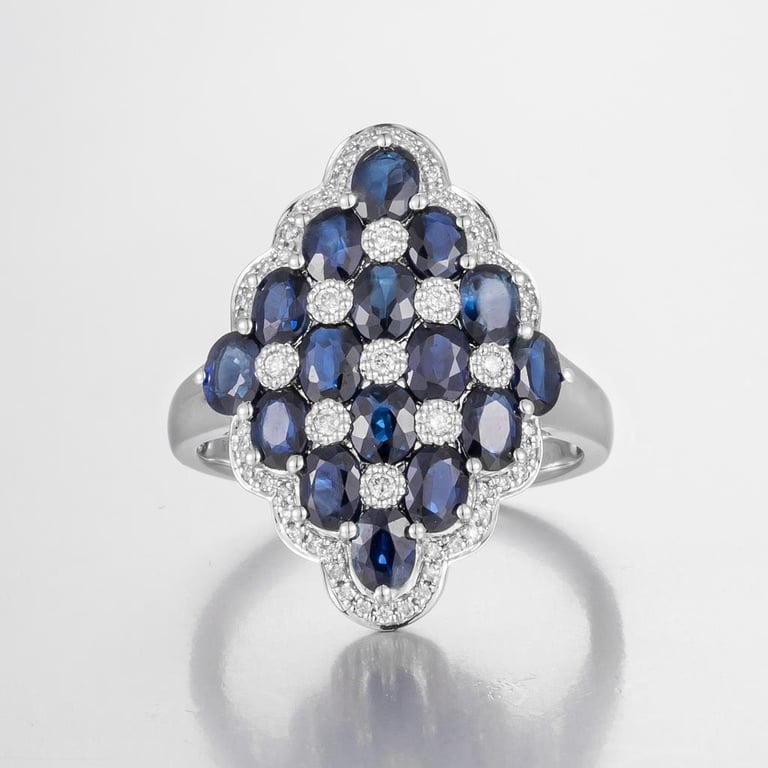 Featuring Centre, 16 Oval Cut, Deep Blue Black Australian Sapphires (3.80Ct Tsw, Heavily Included), Claw Set, With 59 Round Brilliant Cut Diamonds (0.18Ct Tdw, F-G Colour, Vs2 Clarity), Claw/Pip Claw Set. Ring Size O.